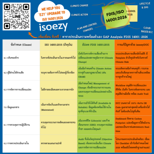 จากประกาศล่าสุด (Final Draft International Standard – FDIS) มาตรฐาน ISO 14001:2026 ได้เพิ่มข้อกำหนดที่เข้มงวดเกี่ยวกับ Climate Action ซึ่งกระทบต่อบริษัทกว่า 6,000 แห่งในไทย หากไม่รีบปรับตัว คุณอาจพลาดโอกาสทางธุรกิจและการยอมรับในระดับสากลครับสิ่งที่เปลี่ยนไปใน FDIS 14001:2026 (ที่คุณต้องเจอ)